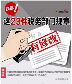为落实党和国家机构改革相关要求,国家税务总局近日对23件税务部门规章部分条款予以修改,以“国家税务总局令第44号”的形式对外公布,便于纳税人及时了解掌握税收政策变化情况,并于2018年6月15日起施行。
