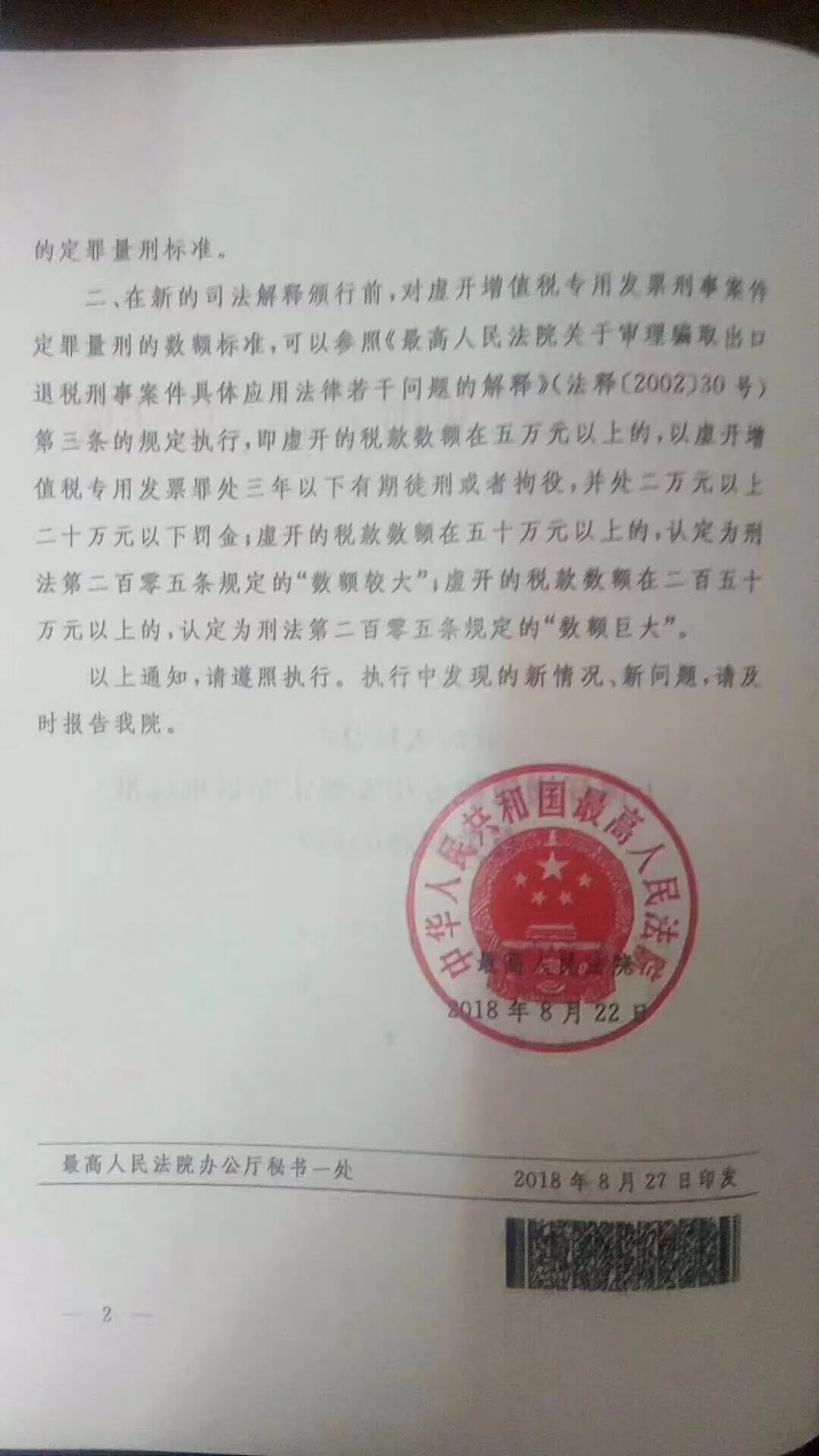 一、自本通知下发之日起,人民法院在审判工作中不再参照执行《最高人民法院关于适用<全国人民代表大会常务委员会关于惩治虚开、伪造和非法出售增值税专用发票犯罪的决定>的若干问题的解释》(法发[1996]30号)第一条规定的虚开增值税专用发票罪的定罪量刑标准。