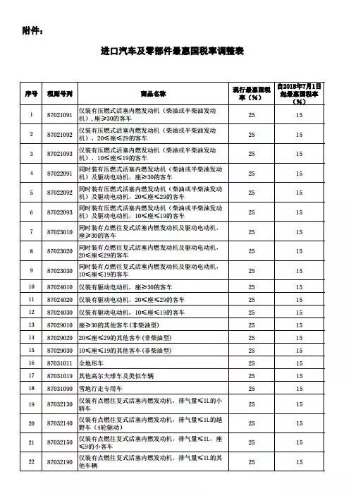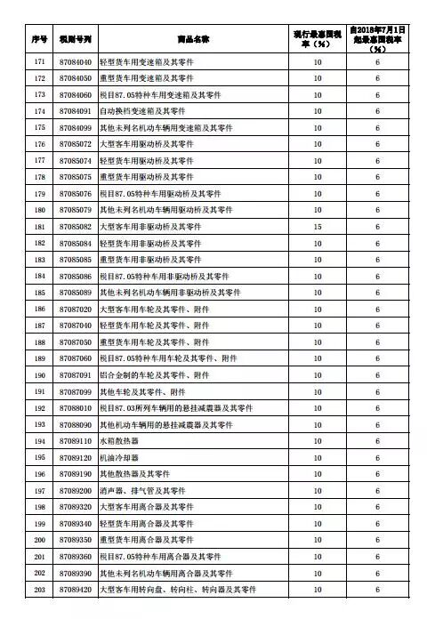 为进一步扩大改革开放,推动供给侧结构性改革,促进汽车产业转型升级,满足人民群众消费需求,自2018年7月1日起,降低汽车整车及零部件进口关税。将汽车整车税率为25%的135个税号和税率为20%的4个税号的税率降至15%,将汽车零部件税率分别为8%、10%、15%、20%、25%的共79个税号的税率降至6%。具体税目及税率调整情况见附件。
