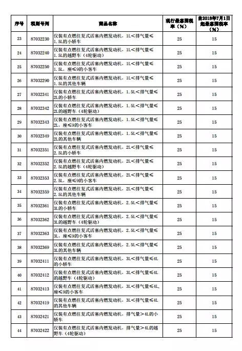 2018年5月22日国务院关税税则委员会印发公告,经国务院批准,自2018年7月1日起,将税率分别为25%、20%的汽车整车关税降至15%,降税幅度分别为40%、25%;将税率分别为8%、10%、15%、20%、25%的汽车零部件关税降至6%,平均降税幅度46%。